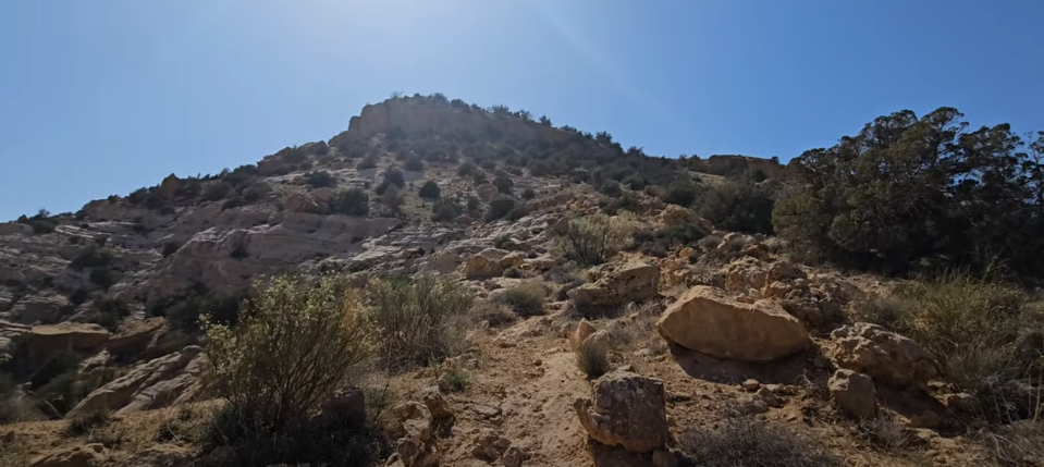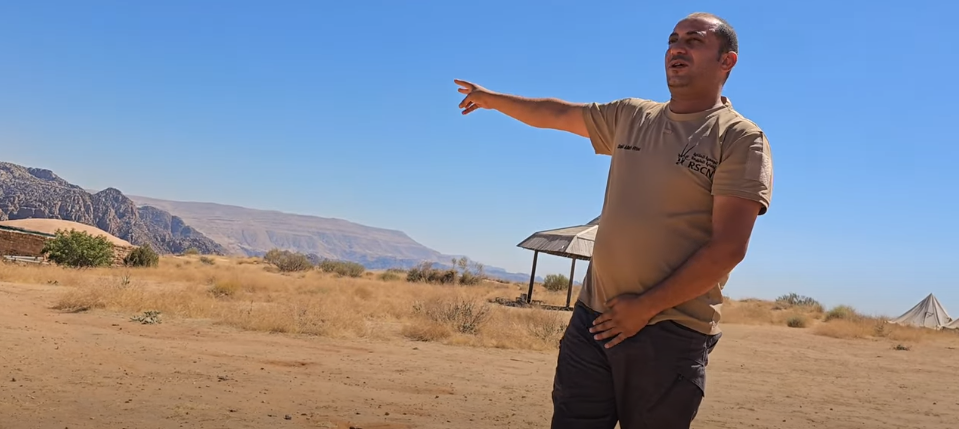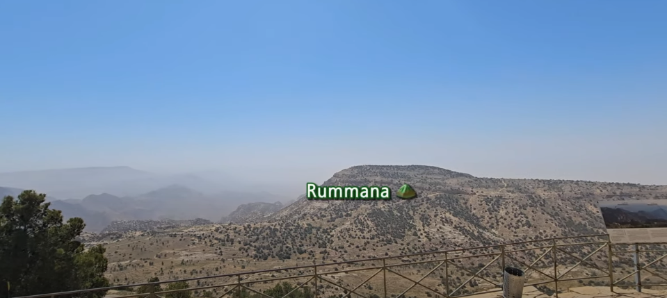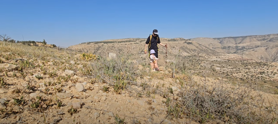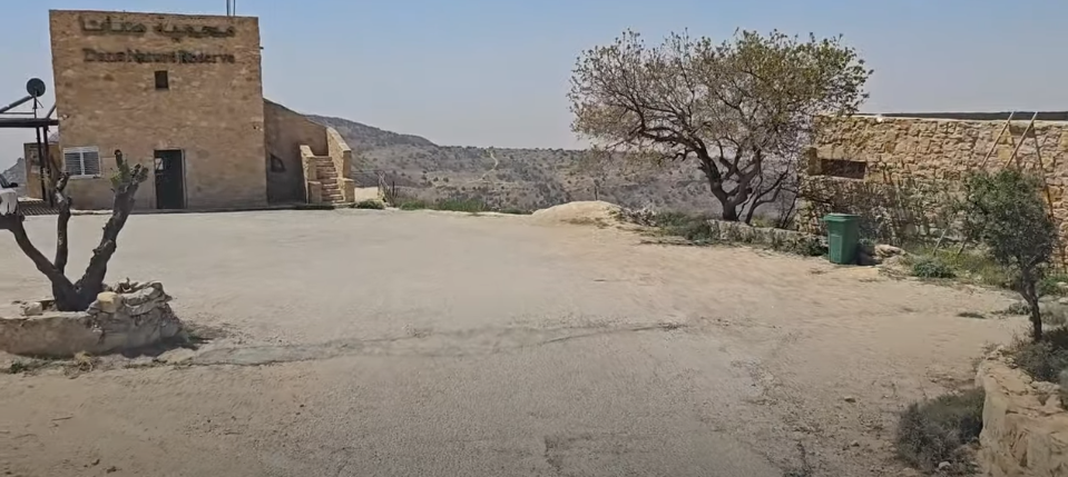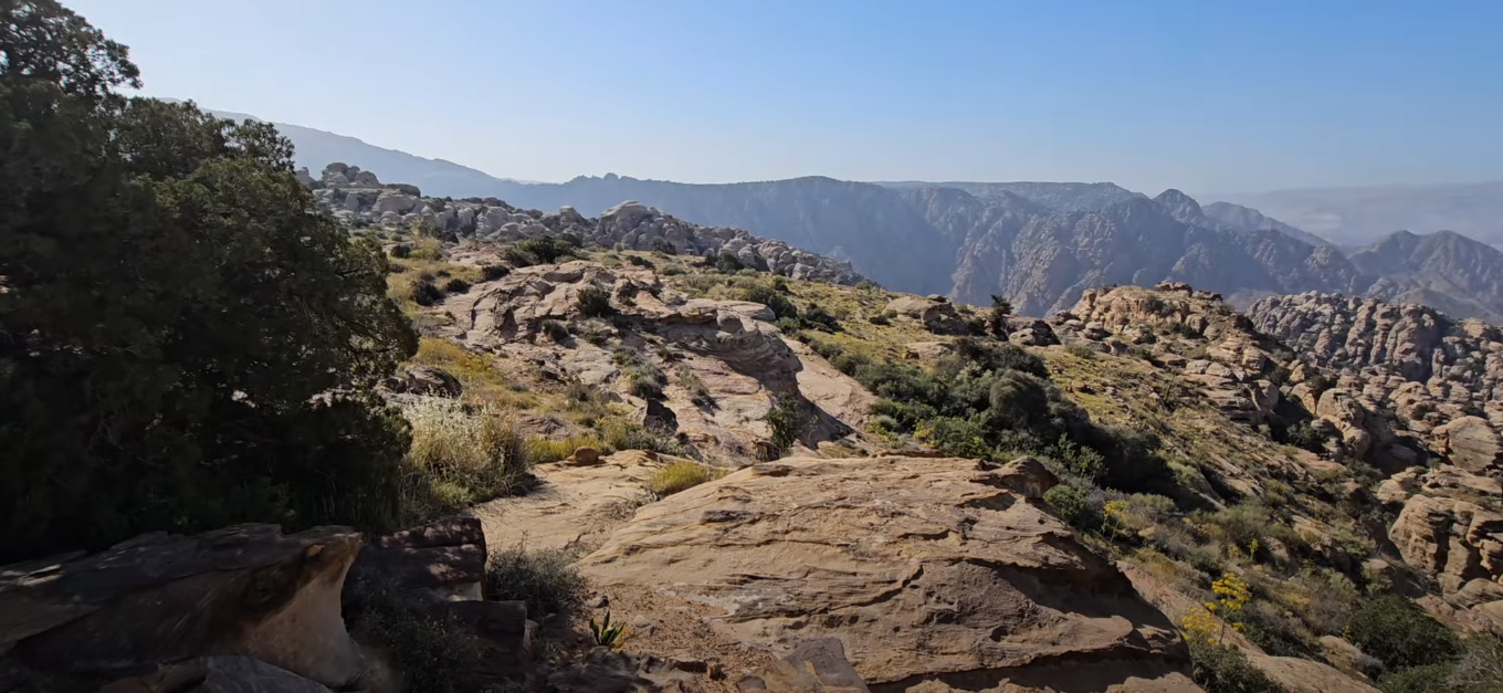 정상에 오면 파란 하늘 아래 남쪽으로 웅장하게 뻗어나가는 다나 협곡이 펼쳐집니다. 나무가 없어 날카롭게 깎인 능선들이 새파란 요르단의 하늘빛과 어울어져 장관을 이룹니다. 이 다나 협곡의 끝자락에 희미한 실루엣의 산이 페트라를 품고 있다고 하네요.
